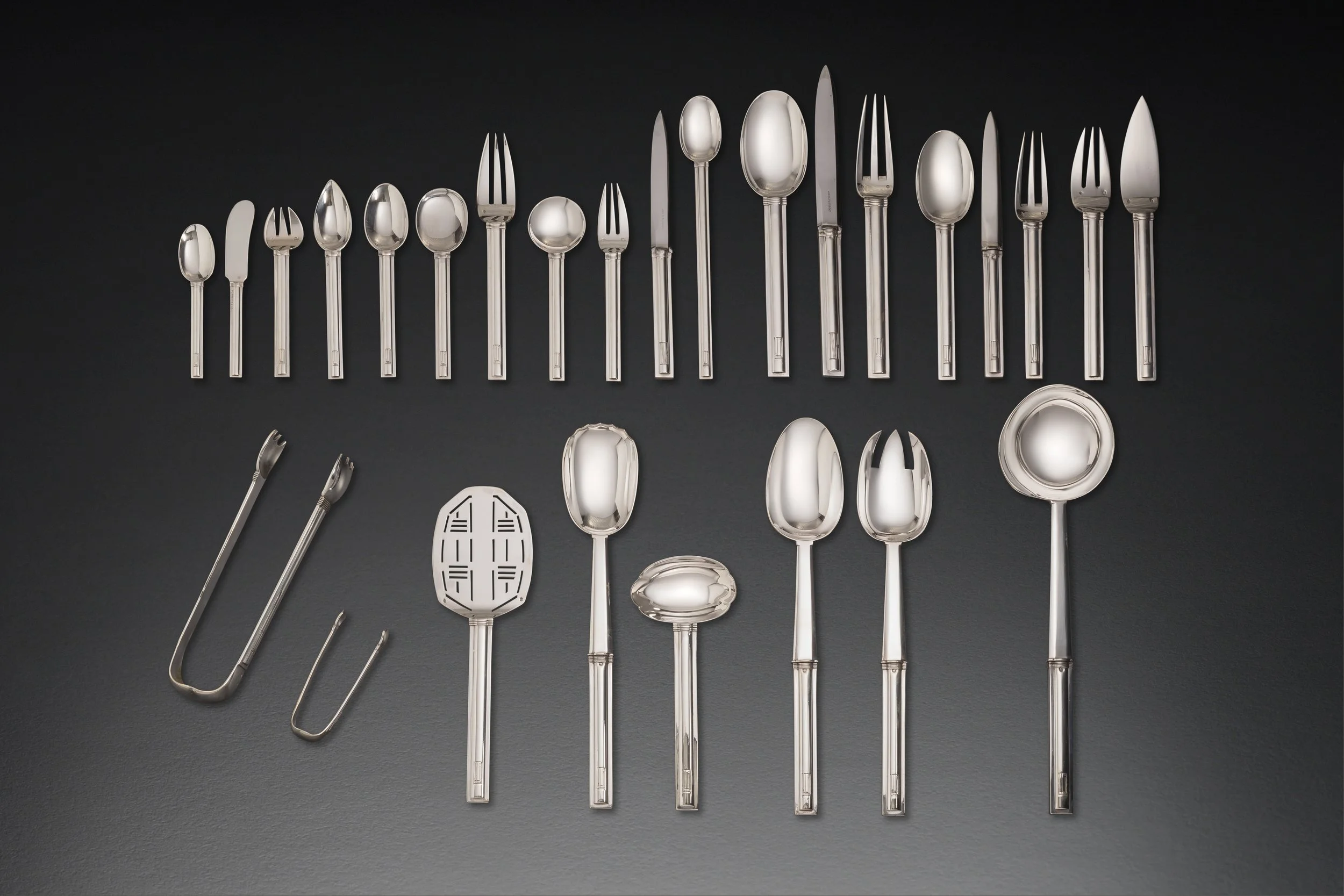 Service de table comprenant 243 pièces, modèle Cannes créé par Jean E. Puiforcat en 1928 à l’occasion de son mariage. Pure style Art Déco. Photo; Luk Vander Plaeste